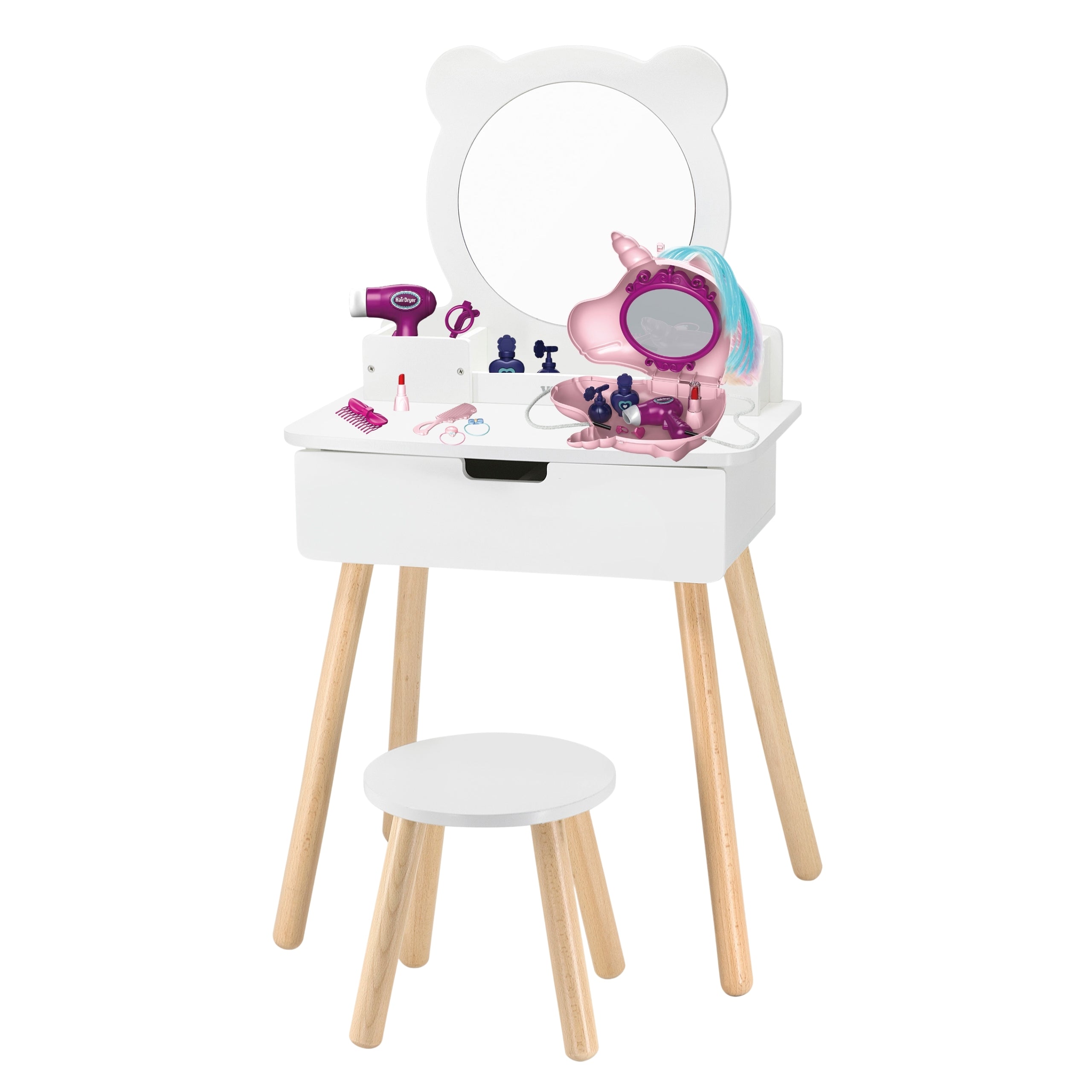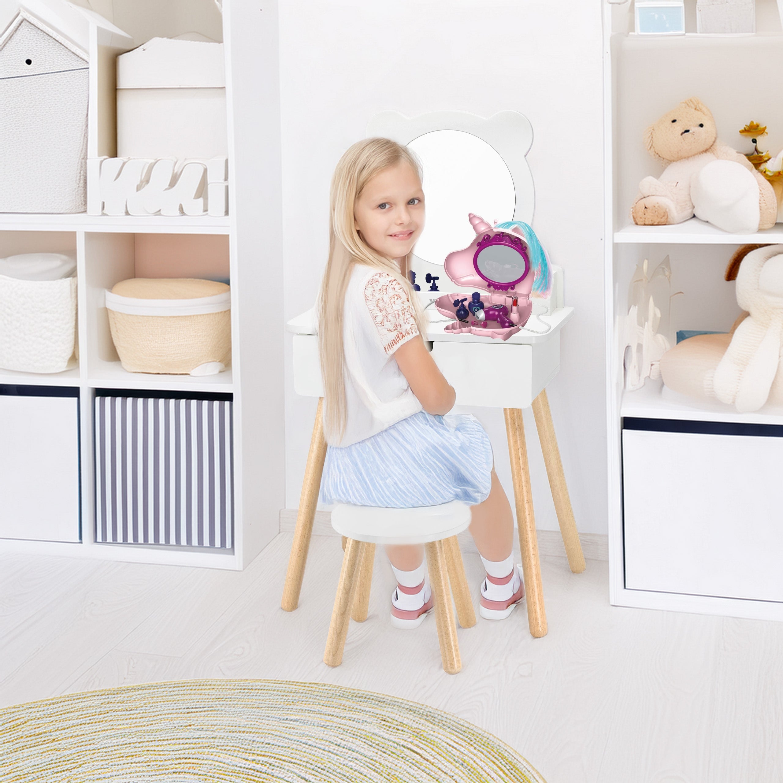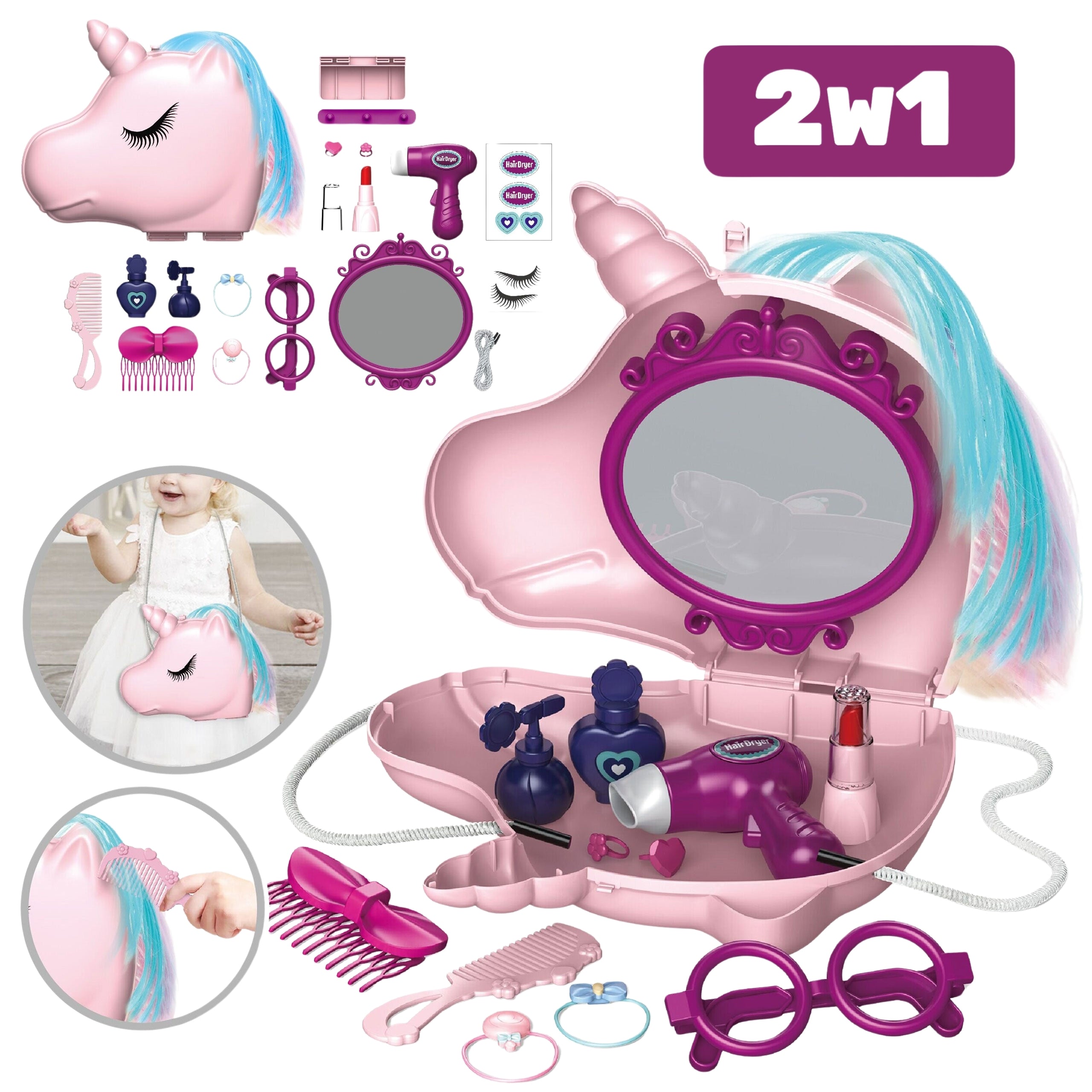 Suur, eraldi seisev valge tualettlaud + komplekt aksessuaare ilusa ükssarviku kotis brändilt Viga on iga tüdruku toa unistuste komplekt. Tualettlaud omab välja tõmmatavat sahtlit, kuhu väike printsess saab peita oma aardeid. Peeglisse on paigaldatud praktilised tarvikud. Komplektis on kaasas ka tualettlaudade iste. Ükssarviku kotis on kõik vajalikud tarvikud nagu ilusalongis.