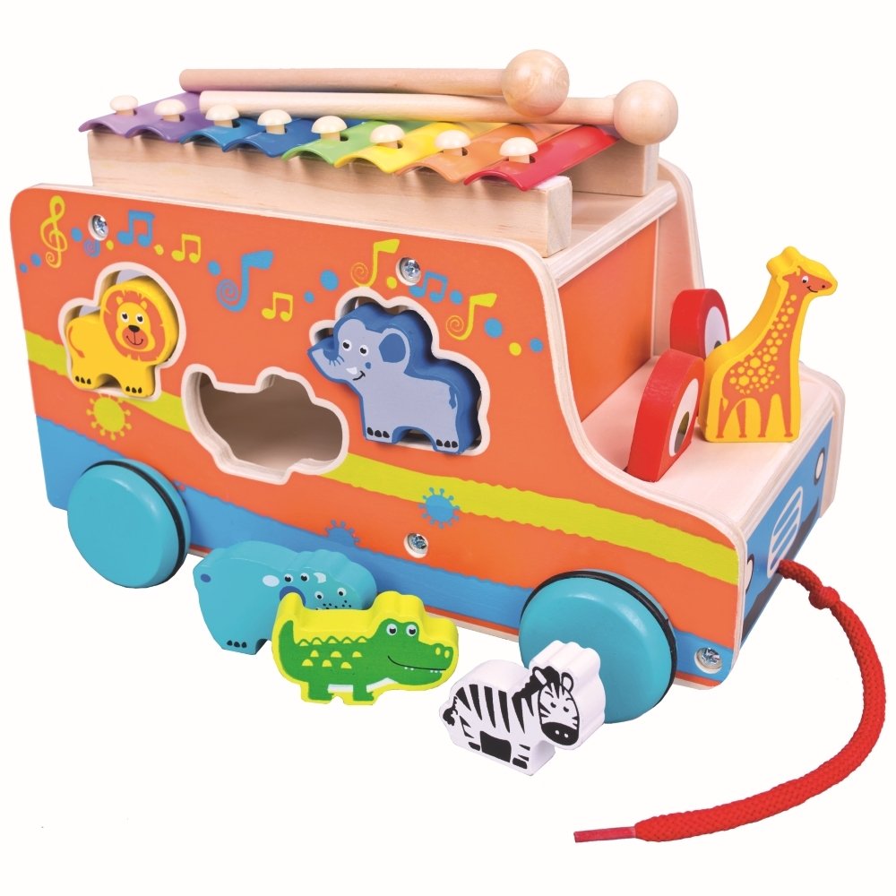 puidust auto - selle külge kinnitatud nöörist tõmmates saab teie laps sõidutada 6 looma: lõvi, krokodilli, elevanti, kaelkirjakut, sebra, jõehobu;