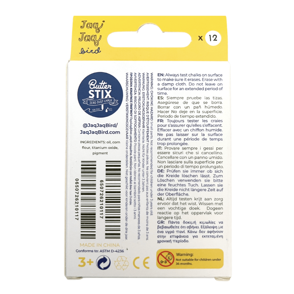 Palun kontrollige alati ButterStix®-i kustutatavust, kui kasutate seda mitte-Jaq Jaq Bird®-i pinnal. Ärge jätke seda pindadele pikemaks ajaks.