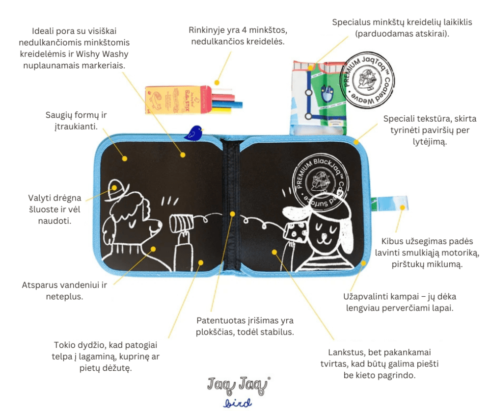 Korduskasutatav ja kustutatav kriidiraamat sisaldab 8 tühja lehte ja 4 pakki of ButterStix® – tolmuvabad kriidipulgad.