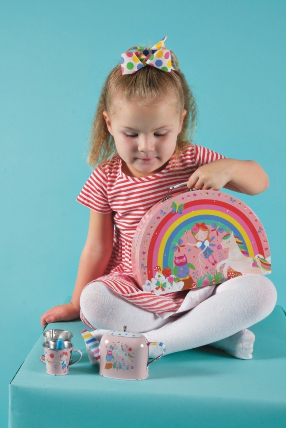 Üks meie enimüüdud tooteid, lapsed ei saa meie üliarmsatest metallist teekomplektidest küllalt! Korduvkasutatavas vikerkaarekujulises kandekotis on teepidu haldjate ja lõbusate metsaloomadega. See 10-osaline teekomplekt sisaldab: 2 teetassi ja alustassi, 2 lusikat, 2 taldrikut ja kaanega teekannu.