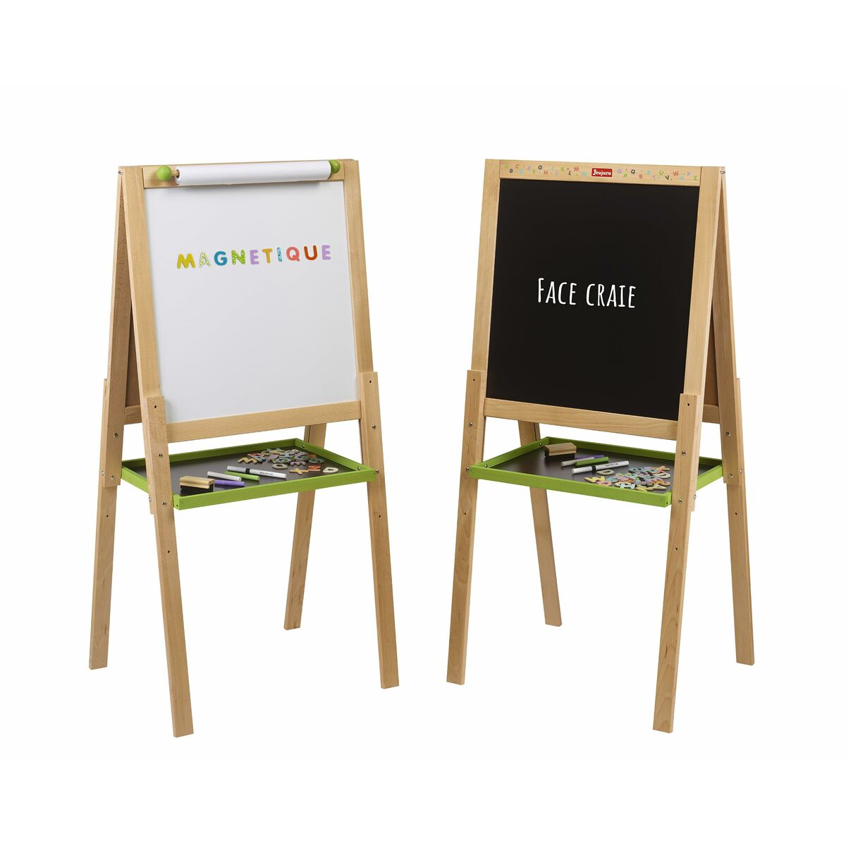 Jeujura kahepoolsest tahvlist on multifunktsionaalne joonistustahvel, mis on mõeldud loovuse ja õppimise toetamiseks alates 3. eluaastast. Valmistatud naturaalsest puidust, mis tagab tugeva ja vastupidava konstruktsiooni, sobides sagedaseks ja ohutuks kasutamiseks haridusmängudes. Tahvlil on kaks erinevat pinda: klassikaline valge tahvel kriidiga joonistamiseks ning magnetiline valge pind, kuhu saab kasutada tahvlikriiditusse või kinnitada magneteid, laiendades mängu- ja õppevõimalusi. Selle ligikaudsed mõõtmed on 56 cm, mis annab lastele piisavalt ruumi ideede väljendamiseks ning mugavaks kirjutamis- ja joonistamisharjutuseks. Disainis kasutatakse mitmevärvilisi toone, mis on visuaalselt atraktiivsed ja ergutavad laste huvi, sobitudes erinevatesse laste keskkondadesse. Originaalne ja pakendamata toode on mitmekülgne vahend peenmotoorika, loovuse ja interaktiivse õppimise arendamiseks, kohandudes erinevatele vanustele ja oskustasemetele. Jeujura tahvel pakub praktilist ja ohutut lahendust koduseks või hariduslikuks kasutuseks, tänu kahepoolsusele, mis võimaldab vaheldada õppe- ja mängumeetodeid, muutes õppimise dünaamilisemaks ja lõbusamaks. Kokkuvõttes on see funktsionaalne ja taskukohane valik neile, kes otsivad vastupidavat ja atraktiivset hariduslikku tuge väikestele lastele.