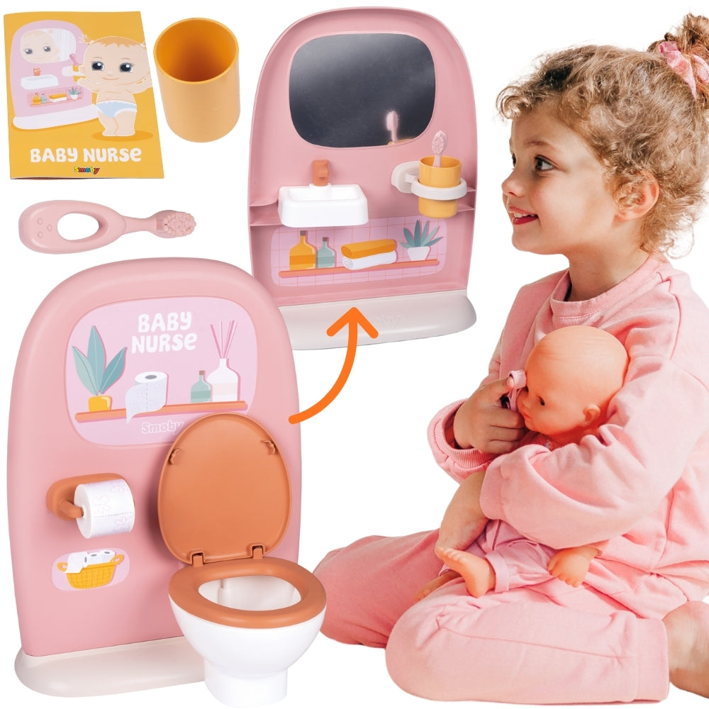 Kaksikülgne tualett Smoby Toys aitab lastel õppida hügieeni põhireegleid, ühendades mure nuku eest hoolitsemise ja rollimängu rõõmu. Ühel poolel on liikuv iste ja tualettpaberirull, teisel poolel aga kraanikauss peegli ja hambaharjaga. Kompaktne mööbel pulberroosade värvidega on silmapaistev oma välimuse ja ohutuse poolest. See on ideaalne komplekt, mis arendab empaatiat, vastutustunnet ning õpetab läbi mängu!